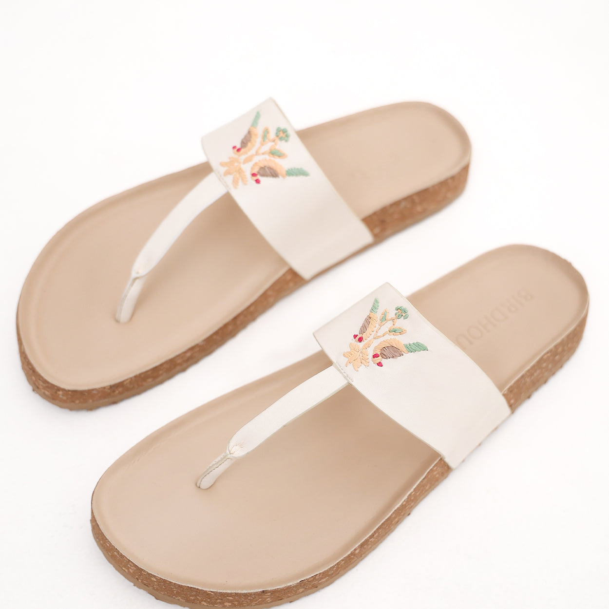 Meet Mitthu, the cherished first design of our collection, featuring a hand-embroidered pair of parrots, affectionately known as 'Mitthu', crafted in raffia thread. This simple yet special style includes a toe strap and is part of our earth-friendly Cork footbed range, complete with built-in arch support and a sustainable Bloom EVA sole made from algae.