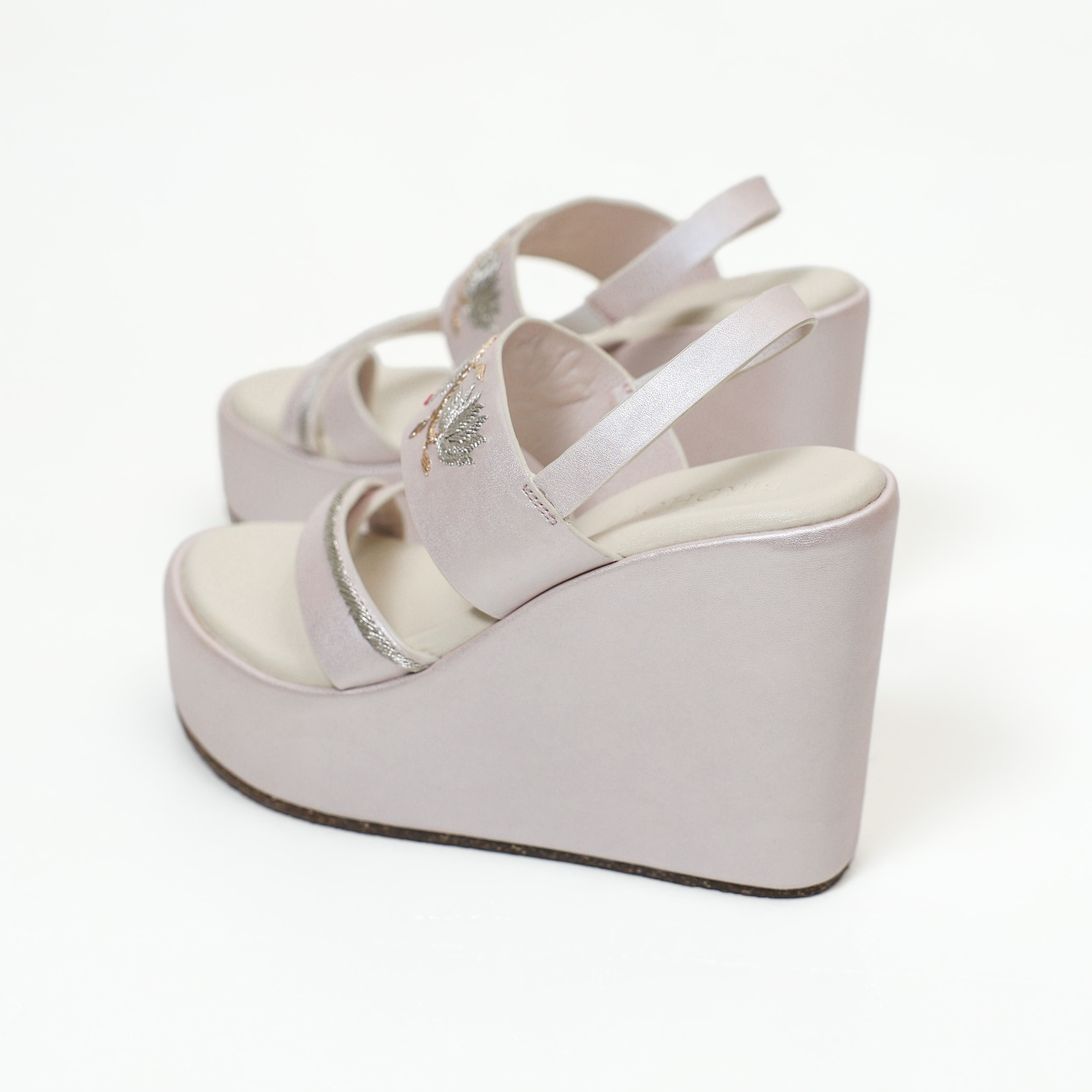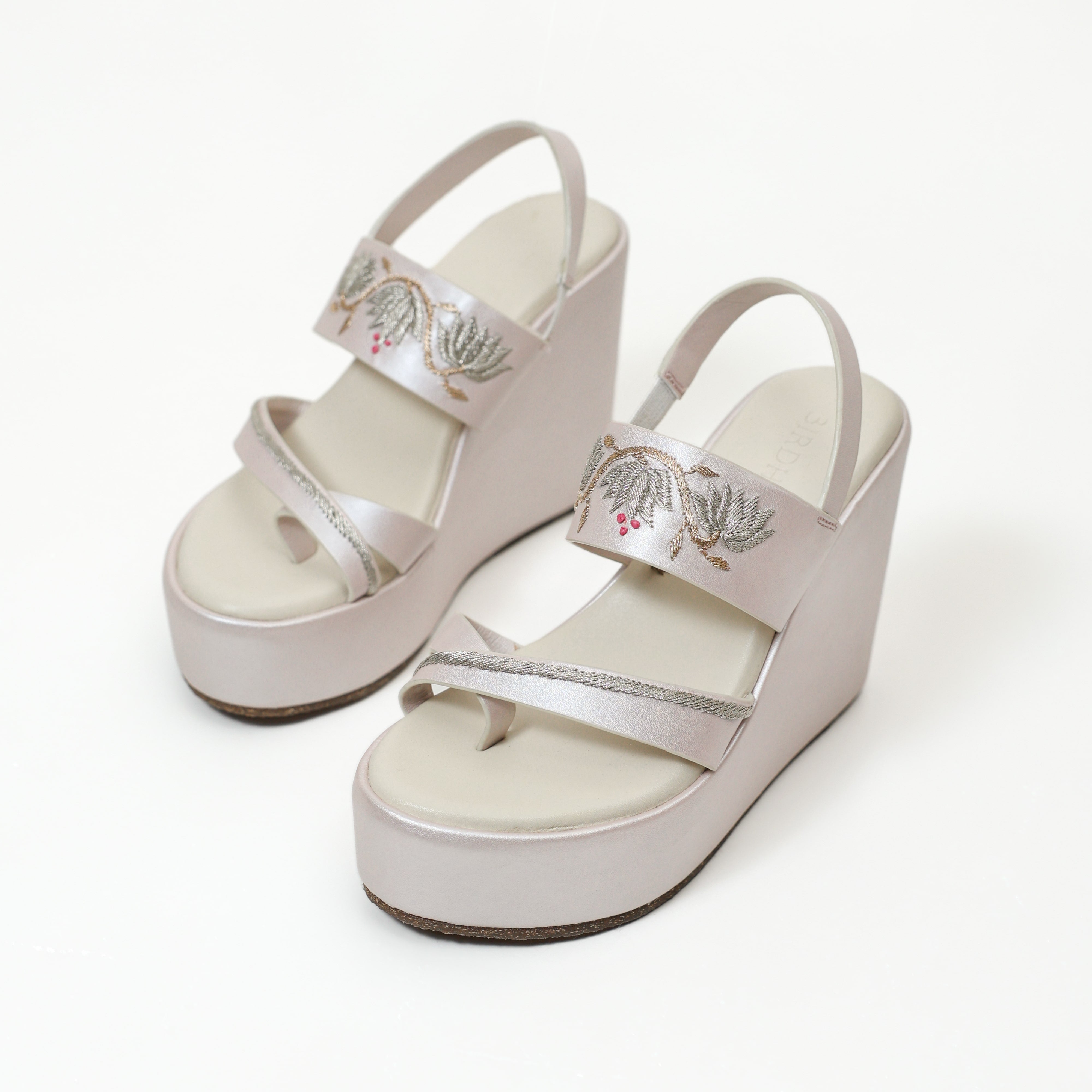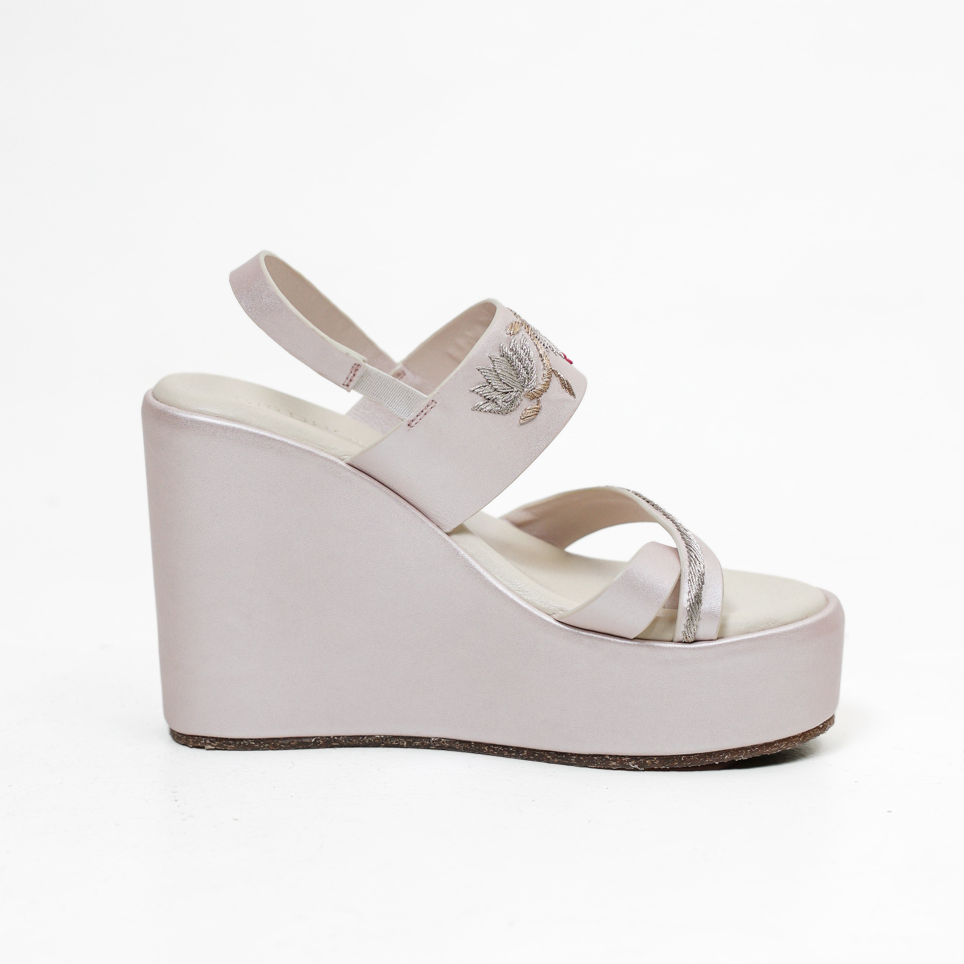 The Trayi Kamal Wedges feature three beautifully hand-embroidered kamal (lotus) motifs with delicate dori work—an elegant blend of tradition and comfort. Designed with a secure cross-toe thong and an elastic back strap, these 4.5” inches wedges ensure a snug grip so you can dance the night away. The eco-foam cushioned insole offers cloud-like comfort, while the lightweight design makes them easy to wear for hours. Perfectly paired with heavy lehengas or festive outfits, these wedges bring grace, height, and stability to every celebration.